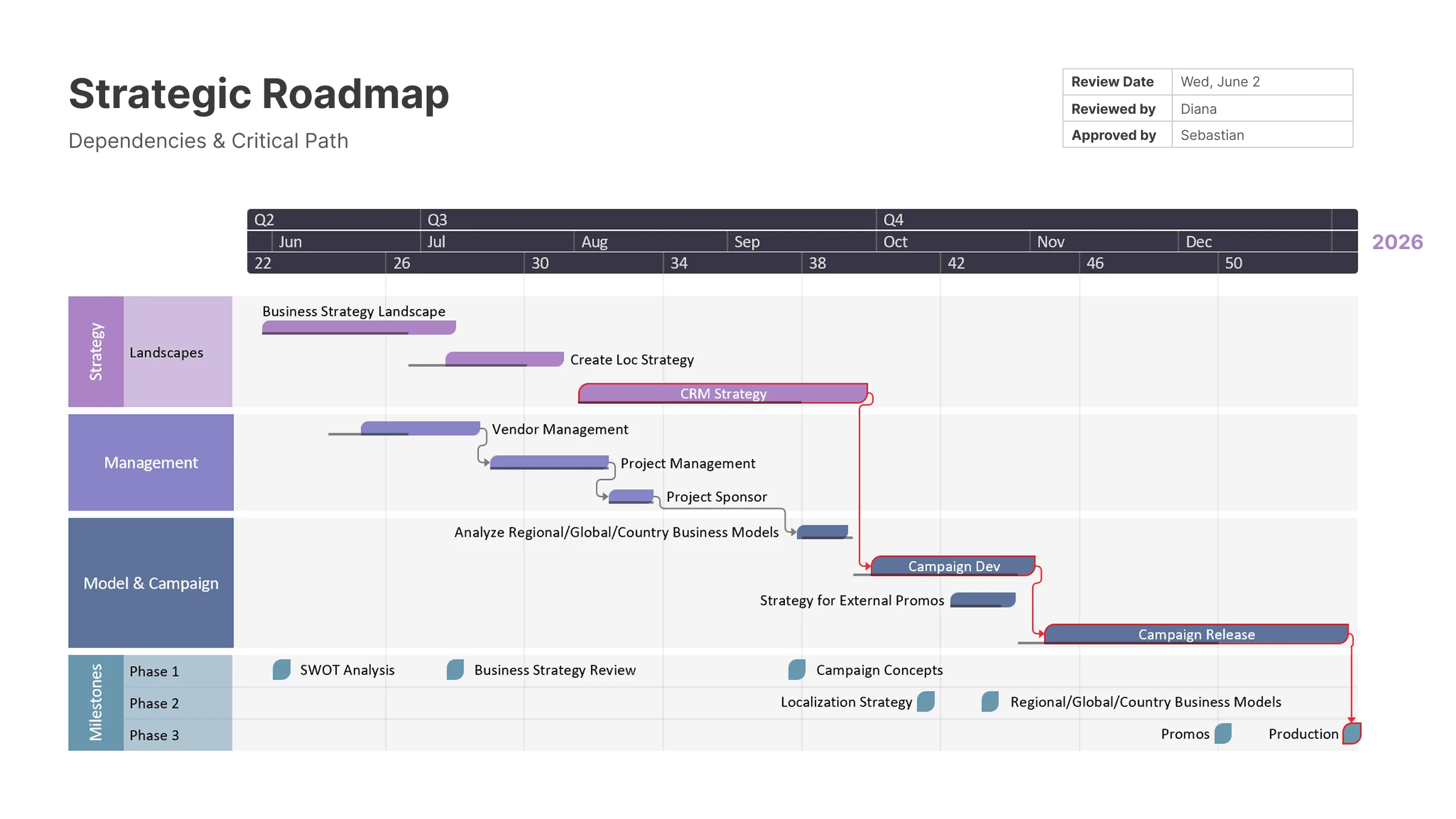 This example shows a comprehensive business strategy rollout organized into distinct swim lanes - Strategy, Management, Model & Campaign, and Key Milestones - each with color-coded tasks that reveal both sequential dependencies and parallel workstreams.
